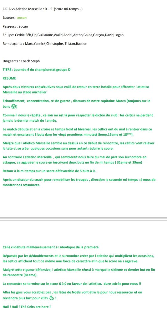 CIC A : 5ème journée de championnat vs Atletico Marseille : 0 – 6 : saison 2024/25 1 réponse Lundi 16 décembre 2024 à 19h30 au stade Michelier. CIC A – Atletico Marseille : 0 à 6. Résumé par Bastien.