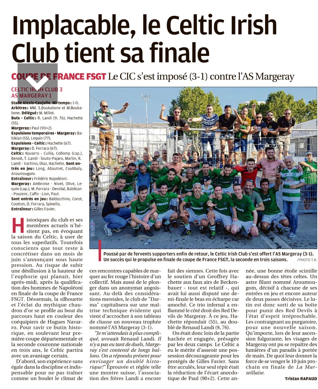 Sur une phase de jeu, Couly veut faire tourner le ballon en s’appuyant sur sa défense mais le ballon arrive dans les pieds de l’attaquant qui ne gâche cette offrande et réduit le score. 3-1 et il reste 10 min. Margeray essaie de pousser un peu plus mais sans grand danger. Le match devient interminable suite aux 5 min d’arrêt de jeu. Les arbitres sifflent la fin du match. Le Celtic tient sa finale.